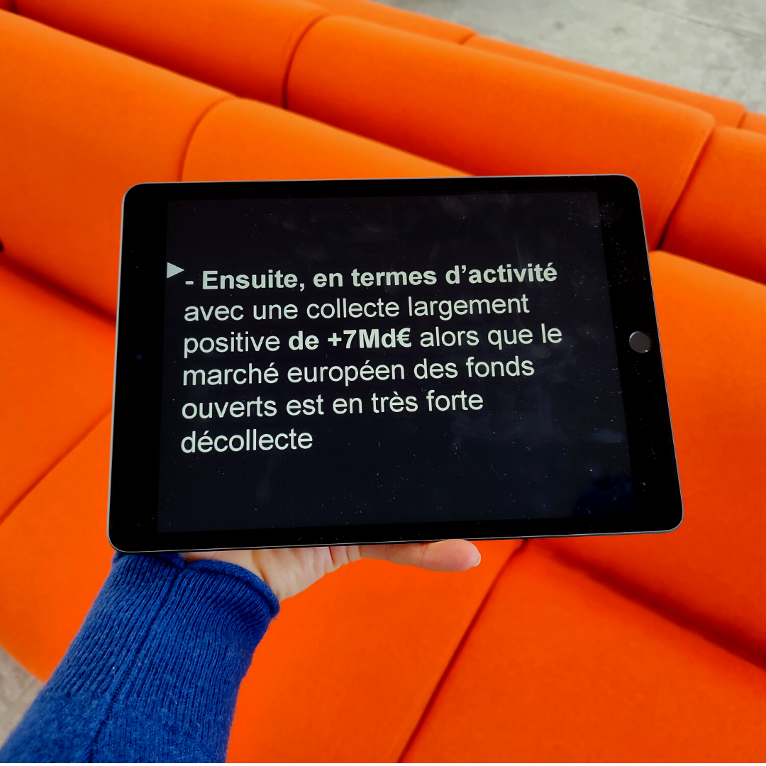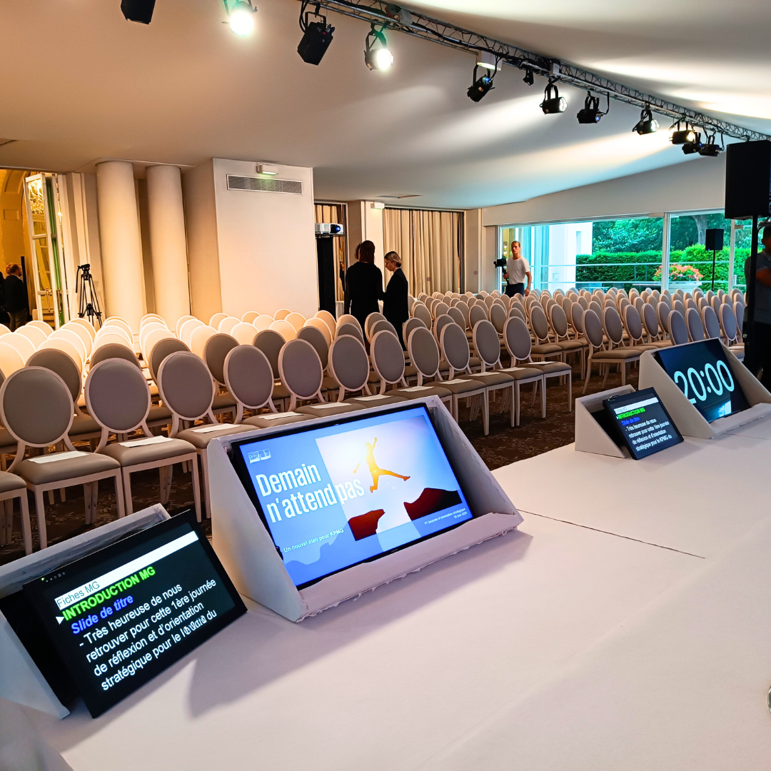 • Événement hybride, webcastUn prompteur caméra + une tablette ? Il est possible de combiner plusieurs systèmes de prompteur pour garantir la fluidité des prises de parole.
